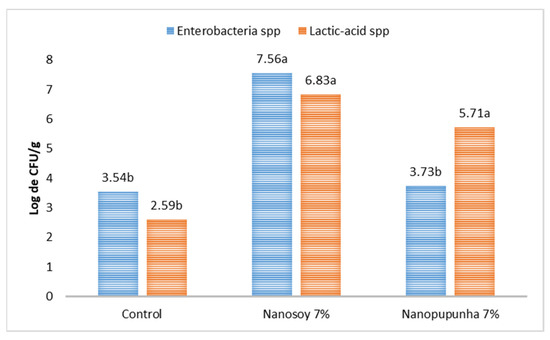 Count of Enterobacteriaceae spp. and lactic-acid bacteria (log CFU/g) in the cecum of growing rabbits fed different diets viz., Control, Nanosoy, and Nanopupunha. Lowercase letters differ statistically based on Tukey’s test (p < 0.05).