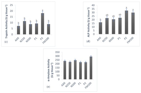 There were significant differences in ALP (brush border enzyme) activity. As in the activity of the total alkaline proteases, the control diets AA0 and FM100 presented differences between them. The groups with additives (P1, N250, and N500) showed similar values, with the P2 group presenting the highest value (Figure 1d).