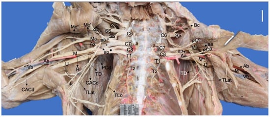 Ventral photographic view of the brachial plexus in a Procyon cancrivorus. (Aa) axillary artery, (aa) ansa axillaris (proximal communicating branch to the median and caudal pectoral nerves), (Ab) brachial artery, (ap) ansa pectoralis (communicating branch to the nn. Pectorales caudales), (Ax) n. axillaris, (Bc) n. brachiocephalicus, (C6–8) cervical spinal nerves, (CACd) n. cutaneus antebrachii caudalis, (M) n. medianus, (Mc) n. musculocutaneus, (Mc′) branch to the m. coracobrachialis, (Mc″) ramus muscularis proximalis, (PCr) nn. Pectorales craniales, (PCd) nn. Pectorales caudales, (R) n. radialis, (Sb) nn. subscapulares, (SS) n. suprascapularis, (T1–T2) thoracic spinal nerves, (TD) n. thoracodorsalis, (TLat) n. thoracicus lateralis, (TLo) n. thoracicus longus, (U) n. ulnaris, (Vb) brachial vein, (+) cranial ventral trunk, (*) cranial dorsal trunk, (black circle) caudal ventral trunk. White bar: 10 mm.