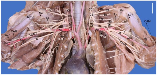 Ventral photographic view of the brachial plexus with arterial relationships in a Nasua nasua. (Aa) axillary artery, (aa) ansa axillaris (proximal communicating branch to the n. medianus), (Ab) brachial artery, (ap) ansa pectoralis (communicating branch to the nn. pectorales caudales), (Ax) n. axillaris, (Bc) n. brachiocephalicus, (Bv) brachial vein, (C5–8) cervical spinal nerves, (CACd) n. cutaneus antebrachii caudalis, (CAM) n. cutaneus antebrachii medialis, (M) n. medianus, (Mc) n. musculocutaneus, (Mc′) branch to coracobrachialis, (Mc″) ramus muscularis proximalis, (Mc‴) ramus muscularis distalis, (PCr) nn. pectorales craniales, (PCd) nn. pectorales caudales, (R) n. radialis, (Sb) nn. subscapulares, (SS) n. suprascapularis, (TD) n. thoracodorsalis, (TLat) n. thoracicus lateralis, (TLo) n. thoracicus longus, (McMT) Mc and M common trunk, (U) n. ulnaris, (Vb) brachial vein, (+) cranial ventral trunk, (*) cranial dorsal trunk, (black circle) caudal ventral trunk. White bar: 10 mm.