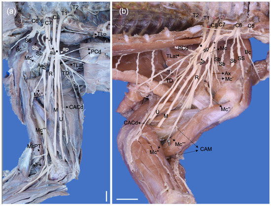 Medial photographic views of a right brachial plexus of a Procyon cancrivorus (a) and a left brachial plexus of a N. nasua (b). (aa) ansa axillaris (proximal communicating branch of the Mc to M), (ap) ansa pectoralis, (Ax) n. axillaris, (Bc) n. brachiocephalicus, (C6–8) cervical spinal nerves, (CACd) n. cutaneus antebrachii caudalis, (CAM) n. cutaneus antebrachii medialis, (M) n. medianus, (Mc) n. musculocutaneus, (Mc′) branch to coracobrachialis, (Mc″) ramus muscularis proximalis, (Mc‴) ramus muscularis distalis, (Mc⁗) distal communicating branch with the median nerve, (Mc*) branch to the joint capsule of the elbow, (McPT) branch to the m. pronator teres, (PCr) nn. pectorales craniales, (PCd) nn. pectorales caudales, (R) n. radialis, (Sb) nn. subscapulares, (SS) n. suprascapularis, (T1-2) thoracic spinal nerves, (TD) n. thoracodorsalis, (TLat) n. thoracicus lateralis, (TLo) n. thoracicus longus, (U) n. ulnaris, (+) cranial ventral trunk, (*) cranial dorsal trunk, (black star) caudal dorsal trunk, (black circle) caudal ventral trunk. White bars: 10 mm.