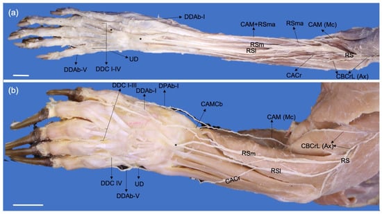 Cranial photographic views of the left antebrachia of a P. cancrivorus (a) and a N. nasua (b). (Ax) n. axillaris, (CACr) n. cutaneus antebrachii cranialis, (CAM) n. cutaneus antebrachii medialis, (CAMCb) communicating branch from CAM to RSm, (CBCrL) n. cutaneus brachii cranialis lateralis, (DDAb-I) n. digitalis dorsalis I abaxialis, (DDAb-V) n. digitalis dorsalis V abaxialis, (DDC I-IV) nn. digitales dorsales communes I-IV, (DPAb-I) n. digitalis palmaris I abaxialis, (Mc) n. musculocutaneus, (RS) superficial branch of the n. radialis, (RSl) lateral branch, (RSm) medial branch, (RSma) accessory medial branch, (UD) dorsal branch of the n. ulnaris, (*) communications between the RSm and RSl. White bars: 10 mm.
