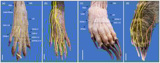 Dorsal photographic views of the dorsal digital nerves: (a) Dissection a left manus of a P. cancrivorus; (b) Scheme of the nerve distribution in a left manus of a P. cancrivorus; (c) Dissection a left manus of a N. nasua; (d) Scheme of the nerve distribution in a left manus of a N. nasua. (CAM) n. cutaneus antebrachii medialis, (CAM-RSma) common trunk of CAM and RSma, (CbR-U) communicating branches between DDAbIV and DDAV, (DDAb-I) n. digitalis dorsalis I abaxialis, (DDAb-V) n. digitalis dorsalis V abaxialis, (DDAV) n. digitalis dorsalis V axialis, (DDC I-IV) nn. digitales dorsales communes I-IV, (DDPA I-IV) nn. digitales dorsales propii I-IV axiales, (DDPAb II-IV) nn. digitales dorsalis propii II-IV abaxiales, (RS) superficial branch of the n. radialis, (RSl) lateral branch, (RSm) medial branch, (RSma) accessory medial branch, (black asterisks) communications between RSm and RSl, (UD) dorsal branch of the n. ulnaris, (yellow lines) distribution of the superficial branch of the radial nerve, (orange lines) ulnar nerve, (green lines) musculocutaneus nerve, (yellow lines) median nerve. The dashed lines indicate the variant communicating branches. White asterisks indicate the number of times that the communicating branch is present. White bars: 10 mm.