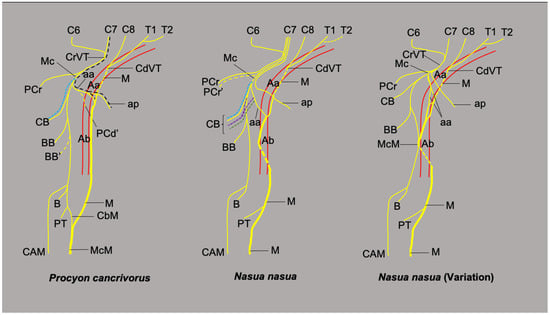 - Enciso-García, L.M.; Vélez-García, J.F. Origin and Distribution of the Brachial Plexus in Kinkajou (Potos flavus—Schreber, 1774). Anat. Histol. Embryol. 2022, 51, 221–235. [Google Scholar] [CrossRef]