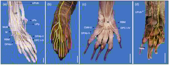 Palmar photographic views of the manus with deep dissections and skin. (a) Palmar photographic view of a deep dissection of a right manus of a P. cancrivorus; (b) Scheme of the palmar nerves in a right manus of a P. cancrivorus; (c) Palmar photographic view of a deep dissection of a left manus of a N. nasua; (d) Scheme of the palmar nerves in a left manus of N. nasua. (CbM-U) communicating branch from UPs to DPC IV, (DPC I-IV) nn. digitales palmares communes I-IV, (DPAb-I) n. digitalis palmaris I abaxialis, (DPAb-V) n. digitalis palmaris V abaxialis, (M) n. medianus, (MCM) common trunk of median and musculocutaneous nerves, (RBM) recurrent branch of M, (UP) n. ulnaris ramus palmaris, (UPs) ramus superficialis, (UPp) ramus profundus, (UPcth) branch to the distal extreme of the antebrachium and carpal tactile hairs, (yellow lines) distribution of the superficial branch of the radial nerve, (orange lines) ulnar, (green lines) musculocutaneous and (yellow lines) median nerves, (dashed lines) variant communicating branches, (*) number of times that the communicating branch is present. White bars: 10 mm.
