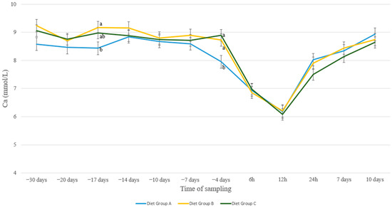 Regarding Ca levels of the three nutritional groups, mild differences between the groups were noticed up to day 7 a.p. Specifically, group A had numerically lower values during most of this period, except for day 17 a.p., where a significant difference between this group compared to group B was detected (p = 0.05, Figure 1) From day 4 a.p., a drastic drop in Ca levels of group A was noticed, whereas this drop was found at 6 h p.p. in the other two groups. As a result, Ca levels of group A differed significantly from those of groups B and C at 4 d a.p. (p = 0.03 and p = 0.005, resp.). Ca levels reached a nadir in all groups at 12 h p.p. and recovered thereafter in a uniform manner in all groups.