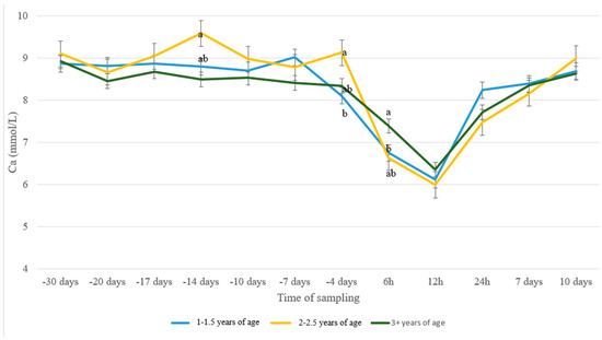 Ca levels (mmol/L) in blood serum of sheep in age groups 1–1.5 (n = 35), 2–2.5 (n = 11) and 3+ (n = 41) years old during the peri-parturient period. a,b Different letters denote significant differences between groups within evaluation time (p < 0.05).