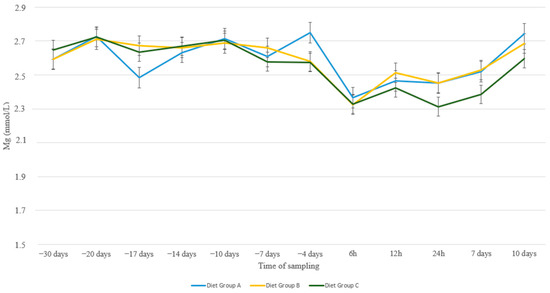 Mg levels (mmol/L) in blood serum of sheep in group A (control group, n = 27), group B (supplemented diet with beet pulp, n = 31), and group C (supplemented diet with beet pulp and anionic salts, n = 29) during the peri-parturient period.