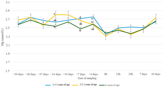 Mg levels (mmol/L) in blood serum of sheep in age groups 1–1.5 (n = 35), 2–2.5 (n = 11) and 3+ (n = 41) years old during the peri-parturient period. a,b Different letters denote significant differences between groups within evaluation time (p < 0.05).