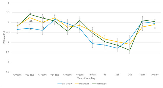 The same trend of peri-parturient drop was evident as well in P levels (Figure 5), with values in every group showing larger fluctuations compared to Ca and Mg values. Animals receiving diet C had increased levels of P compared to animals with diet A at 20 d a.p. (p = 0.05) and at 17 d a.p. (p = 0.02), with ewes in group B showing intermediate values.
