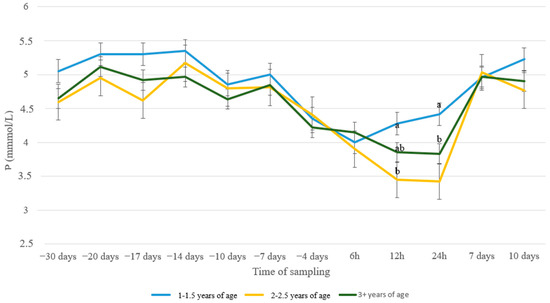 Ewes from 1–1.5 years old recovered P levels sooner, already from 12 h p.p., compared to the other two age groups that recovered after the first 24 h p.p. (Figure 6). As a result, group 1–1.5 showed higher P levels compared to group 2–2.5 at 12 h p.p. (p = 0.03) and compared to both groups 2–2.5 and 3+ at 24 h p.p. (p = 0.005 and p = 0.03, resp.).