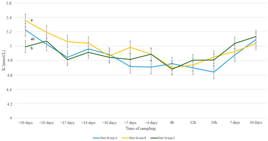 K levels (mmol/L) in blood serum of sheep in group A (control group, n = 27), group B (supplemented diet with beet pulp, n = 31), and group C (supplemented diet with beet pulp and ammonium chloride, n = 29) during the peri-parturient period. a,b Different letters denote significant differences between groups within evaluation time (p < 0.05).