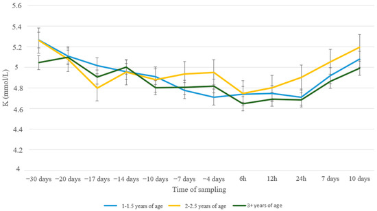 K levels (mmol/L) in blood serum of sheep in age groups 1–1.5 (n = 35), 2–2.5 (n = 11) and 3+ (n = 41) years old during the peri-parturient period.