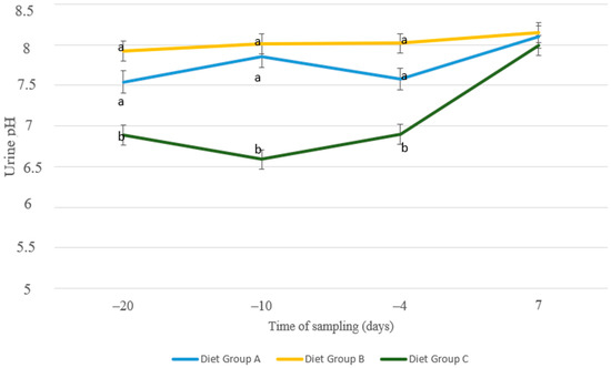 Urine pH of sheep in group A (control group, n = 27), group B (supplemented diet with beet pulp, n = 31), and group C (supplemented diet with beet pulp and ammonium chloride, n = 29) during the peri-parturient period. a,b Different letters denote significant differences between groups within evaluation time (p < 0.05).