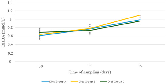 Regarding BHBA, blood levels increased gradually from 30 d a.p. to 15 d p.p. in all groups in a uniform manner. However, no statistical differences were detected (Figure 10).