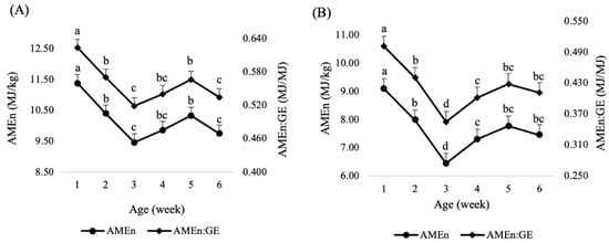 The current findings showed that age influences the AMEn partly through its effect on the digestion and utilization of energy-yielding nutrients, wherein the retention of DM and N is reduced with the advancing age of the broilers. Bartov [] showed that the retention of DM decreased by 2.4% between d 13 and 22 of broiler age. It was also shown that the N retention decreased from 60.1% at d 13 to 57.9% at d 22. Yang et al. [] reported that DM retention increased with age from 75.3% at d 7 to 78.4% at d 28, then declined to 76.2% at d 35 of age. These researchers also reported that the N retention decreased only between d 28 and d 35 from 82.5% to 81.8%, respectively. Fonolla et al. [] demonstrated that the N retention was higher for younger birds (21–26 d) than in older birds (52–57 d) in a corn SBM diet (60.7% vs. 54.0%). Moss et al. [] observed a reduction in the retention of N between young (7–9 d) and older broilers (33–34 d) in corn-based (70.7 vs. 61.7%), sorghum-based (70.4 vs. 57.3%) and wheat-based (69.4 vs. 60.2%) diets.