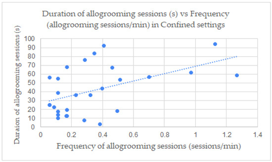 Correlation between frequency (allogrooming sessions/min) and duration (s) of allogrooming session in confined settings. r2 = 0.460612 (p < 0.001); r2 = 0.460612 (p < 0.001).