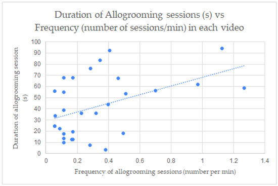 Correlation between frequency (allogrooming sessions/min) and duration (s) of allogrooming session in combined confined and pasture settings (all videos). r2 = 0.494 (p < 0.001).