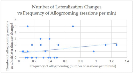 When studying the correlation between the allogrooming measurements of the frequency (allogrooming sessions per min) to duration (s) and lateralization preference in each video (Figure 2, Figure 3 and Figure 4), a positive correlation was found between the frequency (M = 0.346, SD = 0.321) and the duration (M = 41.587, SD = 27.049) of allogrooming in confined settings (Figure 2) with r2 = 0.460 (p < 0.001) (one outlier was removed). There were only four videos in the pasture setting in which allogrooming occurred, so no correlation coefficient was calculated for the pastures setting separately. Correlations between frequency (M = 0.329, SD = 0.317) and duration (M = 42.195, SD = 26.582) for all horses in all settings was also observed (Figure 3) with r2 = 0.494 (p < 0.001). This means the duration increased with the increase in the frequency of allogrooming in confined settings and all settings. There was a positive correlation also between left side allogrooming and duration with r2 = 0.596 (p < 0.001). Additionally, the number of pairs was correlated positively with left side allogrooming with r2 = 0.880. (p < 0.001). Similarly, the same correlations were observed with the right side allogrooming with r2 = 0.534 (p < 0.001) and 0.909 (p < 0.001), respectively. This means no side preference correlated with the number of pairs or duration. While there was no significant difference between preferred lateralization of initiated allogrooming, there were instances where horses changed sides during allogrooming sessions. There was a positive correlation between the frequency of allogrooming and the number of allogrooming sessions in which visual field of view changed in confined settings with r2 = 0.277 (p < 0.01) (Figure 4). There was not enough data to determine the correlation between measures in the pasture setting. In addition, a chi-square test of independence was performed to look at the relationship between lateralization and setting. The relationship between these variables was not significant, X2 (1, n = 143) = 0.0077, p = 0.93023.