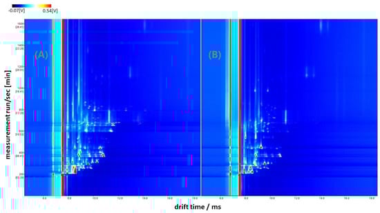 Topographic plots of GC–IMS spectra obtained for acorn-fed (A) and supplementation (B) samples.