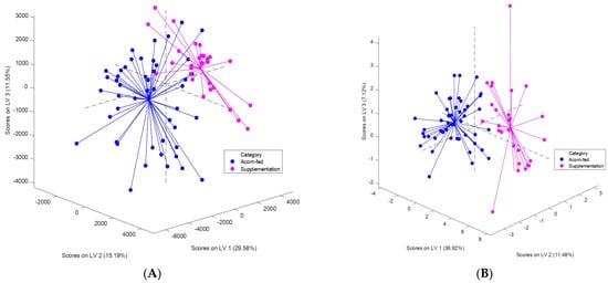In addition, differences could be also observed in Figure 2 between the two group of samples evaluated in both models (Figure 2A,B). The distribution area of points belonging to acorn-fed group was higher than in supplementation group, where points tended to be more concentrated. Although this difference can be noticed in the score plots of both models, it is more marked in Figure 2A (Model 1).