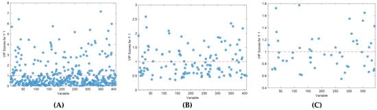 Consecutive VIP score evaluation performed for feature reduction in Model 2 (targeted approach), repeated three times (A–C) and eliminating features with a VIP value < 1.