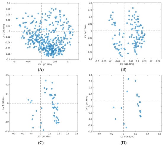 The resulting loading plots of the four models performed for the targeted approach after VIP evaluation are available in Figure 4: Figure 4A is the first PLS-DA model performed with all the 409 initial features; Figure 4B,C constitute the second and third discriminant models obtained after feature (variable) removal through VIP evaluation of Figure 3A,B, respectively; and, lastly, Figure 4D corresponds to the final PLS-DA model performed once the features of Figure 3C with VIPs lower than 1 were removed. Thus, the initial number of features of the PLS-DA model performed with a targeted approach was greatly reduced; while the first model (Figure 4A) was obtained using 409 features or variables, the fourth one (Figure 4D) was performed only with 21 variables, which constitute 5.1% of the initial number. These latter variables are the same 21 which show a VIP value higher than 1 in Figure 3C.