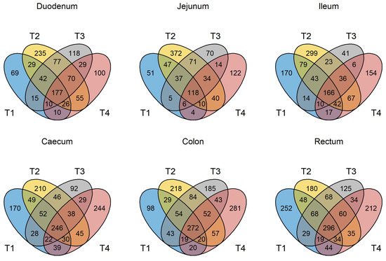 Figure 1. Venn diagram depicting unique and shared OTUs at the genus level in GIT samples from pigs in trials 1 to 4. T1 = trial 1; T2 = trial 2; T3 = trial 3; T4 = trial 4.