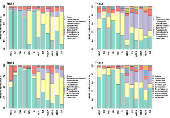 Figure 2. Relative abundance of bacterial taxa annotated to OTUs at the phylum level as identified from GIT samples of piglets fed milk replacer alone or milk replacer with GOS in trials 1 to 4. * UC = unclassified at the phylum level. NGD = Non-GOS Duodenum; GD = GOS Duodenum; NGJ = Non-GOS Jejunum; GJ = GOS Jejunum; NGI = Non-GOS Ileum; GI = GOS Ileum; NGC = Non-GOS Colon; GC = GOS Colon; NGCA = Non-GOS Caecum; GCA = GOS Caecum; NGR = Non-GOS Rectum; GR = GOS Rectum.