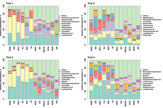 Figure 3. Relative abundance of bacterial taxa annotated to OTUs at the genus level as identified from GIT samples of piglets fed milk replacer alone or milk replacer with GOS in trials 1 to 4. * UC = unclassified at the genus level. NGD = Non-GOS Duodenum; GD = GOS Duodenum; NGJ = Non-GOS Jejunum; GJ = GOS Jejunum; NGI = Non-GOS Ileum; GI = GOS Ileum; NGC = Non-GOS Colon; GC = GOS Colon; NGCA = Non-GOS Caecum; GCA = GOS Caecum; NGR = Non-GOS Rectum; GR = GOS Rectum.