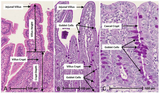 For all trials, immediately after excision, jejunal, ileal, colonic and caecal tissue samples from each piglet were fixed in 10% neutral buffered formalin in 40 mL prefilled specimen jars (Leica Microsystems UK, Ltd., Milton Keynes, UK). These were dehydrated through a series of alcohol solutions, cleared in xylene and embedded in paraffin wax. Sections 3 to 5 µm thick were prepared and stained with either haematoxylin and eosin (HE) to elucidate villus crypt architecture or periodic acid-Schiff (PAS) staining to enumerate mucin-producing GCs (VPG Histology, Bristol, UK). After staining, all HE and PAS slides were scanned using the NanoZoomer digital pathology system (Hamamatsu, Welwyn Garden City, UK). For the jejunum and ileum, measurements of villus height, crypt depth and villus and crypt area were made using the NanoZoomer digital pathology image programme (Hamamatsu). Ten well-oriented villi and crypts per tissue section of each piglet GIT sample from each trial were scanned at 40× resolution. Villus height was measured from the tip of the villus to the crypt opening, with the associated crypt depth measured from the base of the crypt to the level of the crypt opening. The villus/crypt ratio (VCR) was calculated by dividing the villus height by the crypt depth. The GCs were enumerated from ten well-oriented villi and crypts of jejunal, ileal, colonic and caecal sections stained with PAS, and the area of each was measured with individual GCs counted and pinned on each slide. For all tissue samples, both HE and PAS, well oriented villi and crypts were chosen using a random number generator at: (https://www.random.org/, accessed online 7 October 2019) from 1 to 10.