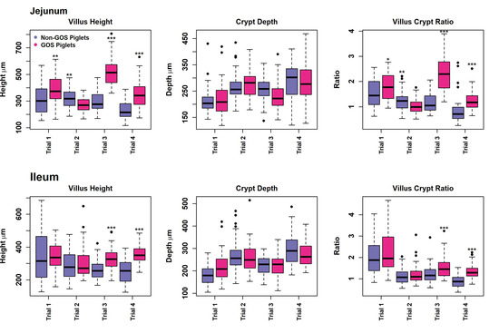 Figure 5. Upper intestinal gut architecture of non-GOS and GOS-fed piglets for trials 1 to 4 showing villus height, crypt depth and villus crypt ratio. (* p < 0.05, ** p < 0.01, *** p < 0.001, Wilcoxon rank sum exact tests). Dots show outliers above maximum interquartile range.