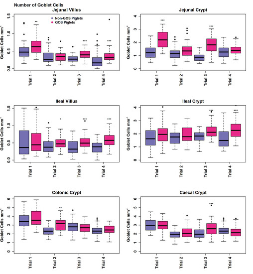 Figure 6. Number of goblet cells per mm2 GIT tissue of non-GOS and GOS-fed piglets for trials 1 to 4. (* p < 0.05, ** p < 0.01, *** p < 0.001, Wilcoxon rank sum exact tests). Dots show outliers above maximum interquartile range.