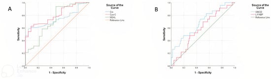 | Variable | AUC | Standard Error | p-Value | Asymptotic 95% Confidence Interval | Sensitivity | Specificity | Cut-Off Value | |