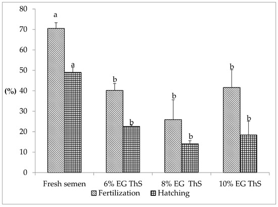 Fertilization and hatching rates of S. cuspicaudus using fresh or cryopreserved semen with different inclusion percentages (6, 8, and 10%) of ethylene glycol (EG). Different letters between treatments indicate differences (p < 0.05). ThS, thawed sperm.