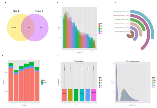 A total of 21,531 and 20,572 circRNAs were identified as QE and HE, respectively. circRNA expression profiling revealed more than 17,298 circular RNAs co-expressed in QE and HE (Figure 1A). Most identified circRNAs were 200–20,000 nucleotides (nt) in length (Figure 1B). Analysis of the number of circRNAs from their host genes revealed that one gene could produce multiple circRNAs and 20,835 circRNAs were produced from 5031 host genes (Figure 1C) (Supplementary Table S2). These reproduction-related candidate genes were mainly distributed on chromosomes 1, 2, and 3 (Supplementary Figure S1). Based on the shear site information of circRNAs and relative position of the gene structure, more than 87%, 8%, and 5% of circRNAs were located in exon, intergenic, and intron regions, respectively (Figure 1D). In the normalized circRNA, the transcript expression levels of QE and HE were similar (Figure 1E).