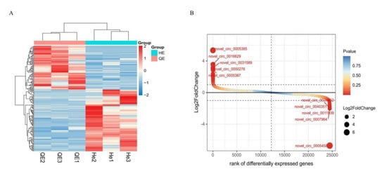 Differentially expressed circRNAs. (A) Heat map of DEcircRNAs. Each column shows one sample and each row represents one circRNA. (B) Bubble-rank plot of differential gene expression of RNA-seq.