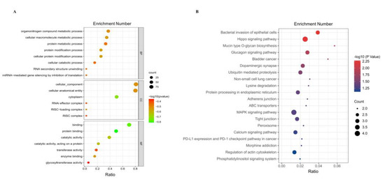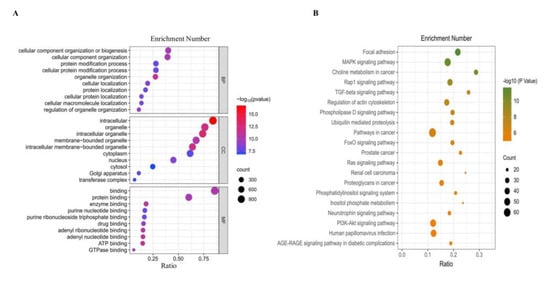 A total of 3040 DEcircRNAs were identified using edgeR and subjected to differential expression analysis, followed by a quasi-likelihood F-test to screen for DEcircRNAs (p < 0.05; Figure 7A,B) (Supplementary Table S8). These DEcircRNA host genes were subjected to GO and KEGG enrichment analyses. The results showed that they were enriched in BP, such as cellular localization, localization of cellular proteins, and localization of cellular macromolecules; CC, mainly belonging to the cytoplasm, organelles, and intracellular organelles with membranes; and MF, including ATP, adenosine nucleotide, adenine nucleotide, and enzyme binding (Figure 8A). The main KEGG signaling pathways included the MAPK, TGF-beta, and PI3K-Akt signaling pathways (Figure 8B).