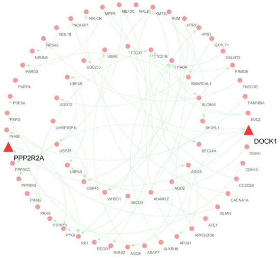 To further elucidate the biological functions of DEcircRNA host genes, all DE-circRNA host genes in the two comparison groups were analyzed using the STRING database. After removing unlinked nodes, clusters of pivotal genes scoring above 0.1 in each PPI network were identified using the Cytoscape MCODE plugin to construct a PPI network consisting of 18 nodes and 18 edges (Figure 4). Subsequently, we sorted all the DE-circRNA host genes according to connectivity and score, novel_circ_0018428 (DOCK1) and novel_circ_0024392 (PPP2R2A), which contain the most nodes and scores, were considered as hub genes.