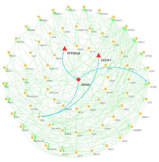 CircRNAs are regulated by upstream TFs. Therefore, we aligned the promoter region sequences of putative hub genes (PPP2R2A and DOCK1) with the animal TFdb database for TF prediction. We identified 81 expressed TFs belonging to the 29TF family (Supplementary Figure S2). A regulatory network of genes and TFs containing 70 nodes and 251 edges was constructed using the Cytoscape software. Our network analysis showed that ARRB1 binds directly to PPP2R2A and interacts with EP300 and SRC (Figure 5). Notably, PPP2R2A is an important regulator of proliferation and apoptosis in lambda endometrial stromal cells [21]. These results suggest that the TF ARRB1 may play an important role in follicle development in sheep.