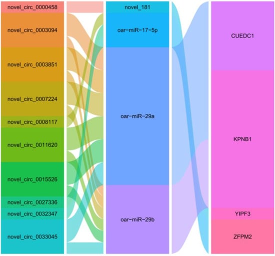 Based on the shared DEmiRNA binding sites and competitive relationships between DEcircRNAs and DEmRNsA, ceRNA pairs with a p-value < 0.05 were screened as the final ceRNA relationship pairs. Finally, the ceRNAs were visualized as an alluvial plot drawn using the ggalluvial package.