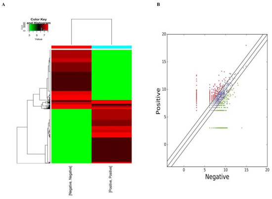 Oar-miRNA-125b potentially binding DEcircRNA. (A) Heat map of 3040 DEcircRNA. Each column shows one sample and each row represents one circRNA. (B) Positive vs. negative DEcircRNA scatter plots. Red dots indicate upward adjustment, turquoise dots indicate downward adjustment.