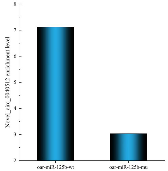 CircRNAs mediate STAT3 expression by regulating the miR-125b axis and affect its function [22]. Previously, our project team showed that oar-miRNA-125b expression was significantly upregulated in the ovaries of Cele black sheep compared to that in Hetian sheep and targeted the STAT3 gene in ovarian granulosa cells [23]. In this study, a DEcircRNA-DEmiRNA network was constructed, and seven downregulated circRNAs that target oar-miR-125b were identified (novel_circ_0000458, novel_circ_0009713, nov-el_circ_0011620, novel_circ_0011939, novel_circ_ 0040508, novel_circ_0040512, and nov-el_circ_0019713). We observed a correlation between these DE-circRNAs and miRNA-125b expression. Accordingly, combined with high-throughput sequencing, miRNA pull-down was used to explore the oar-miR-125b binding of DEcircRNA. oar-miR-125b pull-down was first performed, followed by total RNA extraction for circRNA sequencing. The results showed that 3880 and 3666 circRNAs were identified in the biotin-labeled oar-miR-125b probe group (positive) and control group (negative), respectively (Supplementary Table S7).