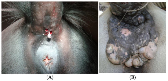 In contrast, the more advanced and commonest forms of the disease (dermal melanomas and dermal melanomatosis), are not so easy to manage (Figure 1B). Despite this, surgical excision may be an option in small dermal melanomas or in cases of physiological function disturbance due to tumor growth, such as rectal or perianal obstruction. Coalescent masses can be removed totally or partially to improve the horse’s quality of life, although the procedure is likely challenging and reconstructive surgery could be required [53,54]. In some cases of extensive tumors on the tail, tail amputation could be considered. However, when facing an anaplastic malignant melanoma, even with this aggressive intervention, the outcome is poor [54]. In non-grey horses, wider margins must be taken whenever possible, trying to remove every neoplastic cell, since the likelihood of tumors being malignant and behaving aggressively is bigger than in grey horses. Furthermore, in these cases, histologic examination should always be done [53]. Partial excision may stimulate tumor regrowth and metastatic spread, demonstrating the importance of surgical intervention when total excision can be achieved [53,54]. Groom and Sullins [55] removed large (≥4 cm) single and coalescent melanocytic tumors from 38 horses and followed up the cases for 12 months. Tumor regrowth after surgery was not seen in any case, and no sudden change in size or behavior was noted in the remaining tumors.