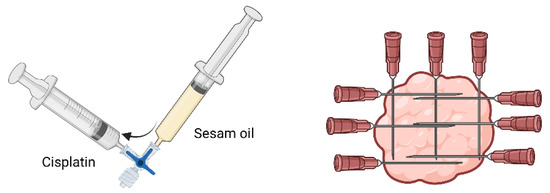 Cisplatin preparation and injection. The tumoral mass should be injected in multiple plans to ensure that cisplatin is equally distributed (created with BioRender.com).