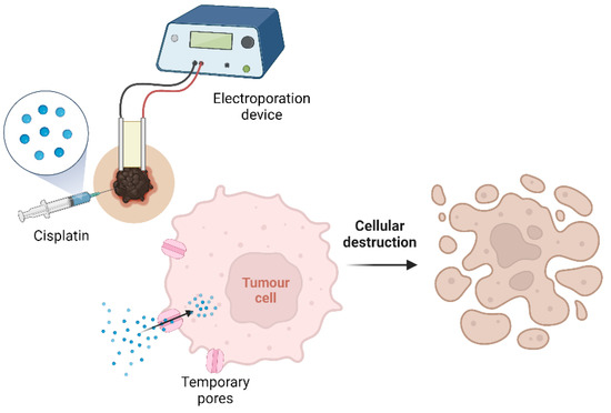 Electrochemotherapy is an anticancer therapy that links chemotherapy drugs with electric pulses. It consists of the application of high voltage and low duration electric pulses that result on formation of temporary pores on the cell membrane [64]. Those pores allow drugs to reach the cytoplasm, resulting in cell damage (Figure 3). This technique increases cisplatin uptake and could be applied alone or combined with surgery, increasing electrochemotherapy efficacy [65]. It is also advantageous in anatomical places where a surgical approach is challenging, such as the perianal and eyelid areas.