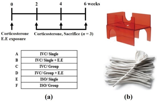 The experimental design is shown in Figure 1a. The mice were divided into six groups (nine mice/group) after an initial week of acclimatization, as follows: (A) IVC/Single; (B) IVC/Single + (Environmental Enrichment) E.E; (C) IVC/Group (Group: three mice in one cage); (D) IVC/Group + E.E; (E) ISO/Single; and (F) ISO/Group. Both cage systems (Tecniplast, Buguggiate, Varese, Italy), IVC (Cat No: GM500) and ISO (Cat No. ISO cage-N), had an air-circulation system in each cage, with the main difference being whether room air outside the cage was allowed to enter into the cage with mice inside. In the IVC cage, the air in the cage is not only circulated by the automatic blower system, but room air outside the cage also enter into the cage. Room air outside the cage can enter through the HEPA filter (size: 141 mm × 170 mm, efficiency: 0.3 micrometer of the particle at 99.5%) on the IVC lid, while in the ISO cage (size: 73 mm × 73 mm × 24 mm, efficiency: 0.3 micrometer of the particle at 99.97%), room air outside the cage is completely blocked and air in the cage is forcibly circulated only by the automatic blower system. Therefore, the air in the IVC cage is circulates better than the air in the ISO cage.