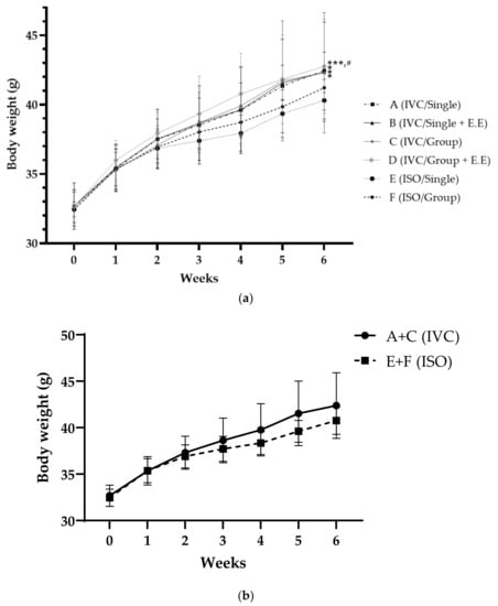 Body weight changes in (a) each group and (b) groups A + C and E + F (* p < 0.05 and *** p < 0.001 compared to E, # p < 0.05 compared to F), (0~2 weeks: n = 9/group, 2~4 weeks: n = 6/group, 4~6 weeks: n = 3/group).