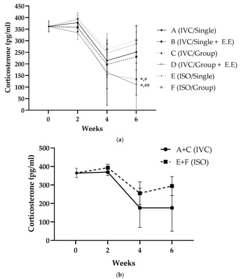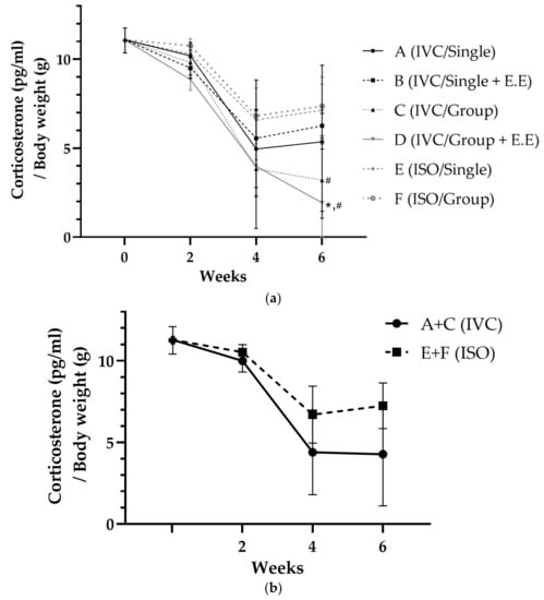 In this study, body weight can be an indicator of stress level, as it is generally known that stress can cause the amount of feed intake and body weight to decrease [16,17,18]. This study reports that animals exposed to stress might have a decrease in the body weight gain rate. Based on the results of body weight for the groups, group D (IVC cage/Group + E.E), in which body weight increased the most, was less stressed, and group E (ISO cage/Single), with the least body weight gain, represented the more stressful environment (Table 1). Corticosterone in the blood is a factor widely known to increase when a mouse is exposed to stress [19]. Therefore, based on the results of the serum corticosterone concentration, the mice of group D (IVC cage/Group + E.E), with the lowest concentration, were the least stressed, and those of group F (ISO cage/Group), with the highest concentration, were the most stressed. Overall, the concentration of serum corticosterone was the highest in the second week and then decreased. The results of the relative serum corticosterone (corticosterone/body weight) were generally similar to the serum corticosterone results, with the only change being in the order of group A (IVC/Single) and group B (IVC/Single + E.E). This slight change means that stress had no biased effect on either body weight or corticosterone blood levels. The serum corticosterone concentrations were similar between weeks 0 and 2, but the relative corticosterone levels decreased at week 2. We judged that this was due to the maintained corticosterone concentration contrary to the increased body weight.