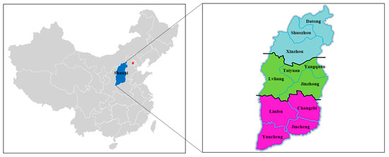 Map showing the geographical locations of 11 administrative cities in Shanxi Province, north China, where cattle blood samples were collected. Sky blue represents north Shanxi Province; grass green represents central Shanxi Province; magenta represents south Shanxi Province. Red pentagram represents Beijing city, the capital of China.